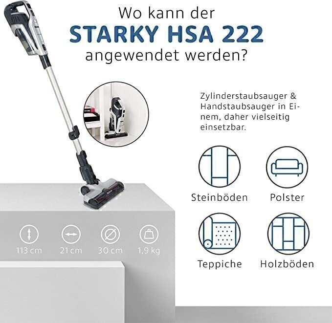 با وجود نشانگر LED و طراحی ارگونومیک جارو شارژی ایستاده مدل Starky HSA 222 می توانید با کمال اطمینان و کمترین میزان خستگی محل زندگی خود را تمیز کرده و جارو کردن را به یک تفریح لذت بخش مبدل کنید !